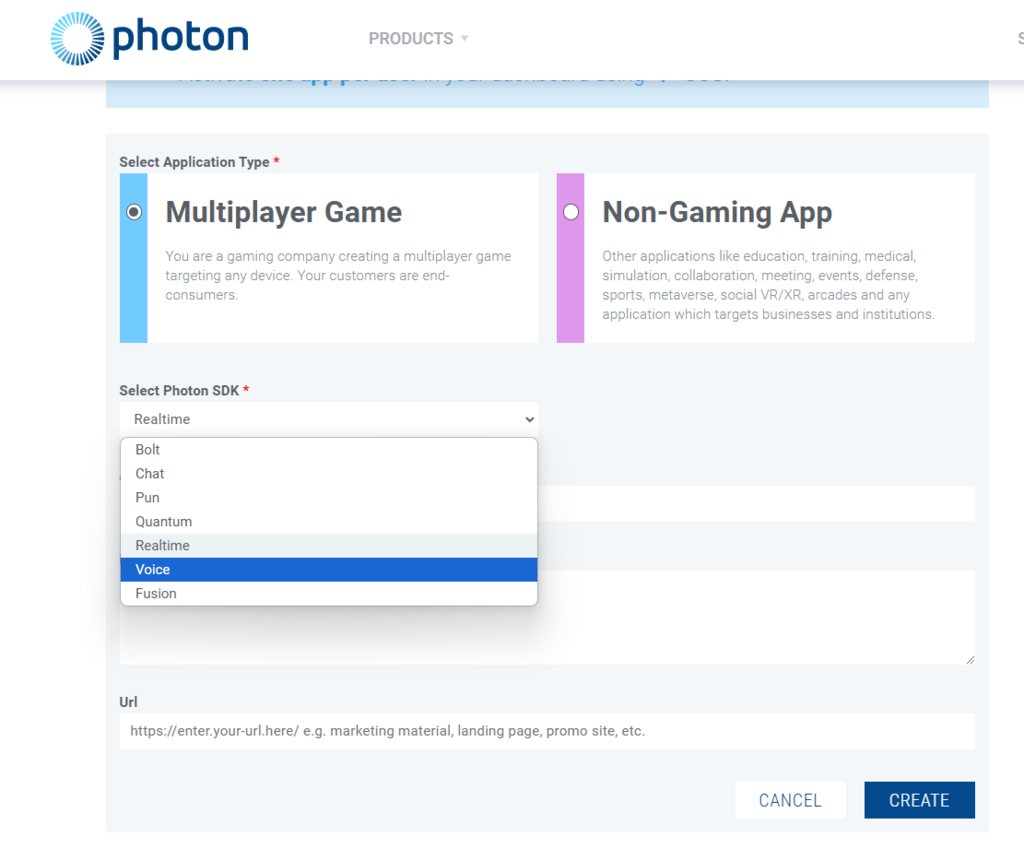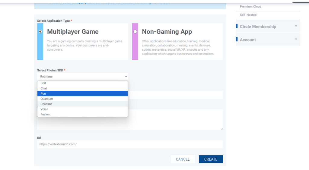 Select "multiplayer game" and give your app a name. Select PUN from dropdown.