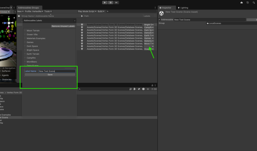 Drag and drop the new scene into the Addressable Group Window. Select the scene and rename it, keeping only the scene name.