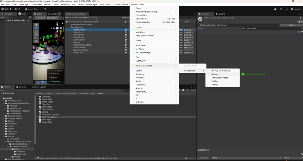 By default, Addressables are built into the local folder, and the final .apk file will include these environments. Steps for Remote Addressables (cloud delivery) will be explained later.