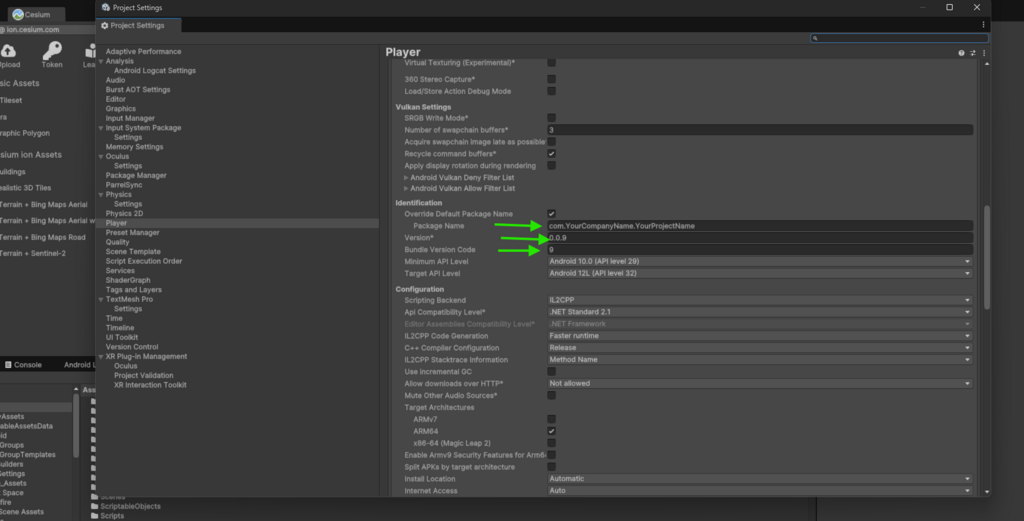 Scroll down to Identification and fill in the Package Name, Bundle Version, and Package Version. Each time you upload a new .apk to Meta Quest, increment the version number. Following Semantic Versioning is recommended for naming your builds.