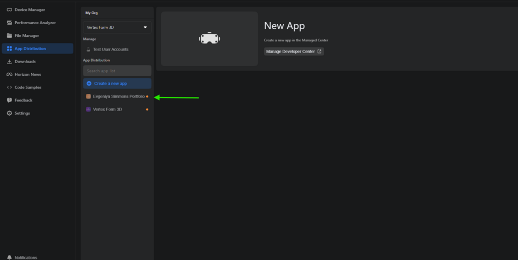 Install Meta Quest Developer Hub on your desktop and sign in with your Meta account. Navigate to App Distribution, then click Create a New App. Enter a name for your app, return to the Developer Hub, refresh the page, and your new app will appear.