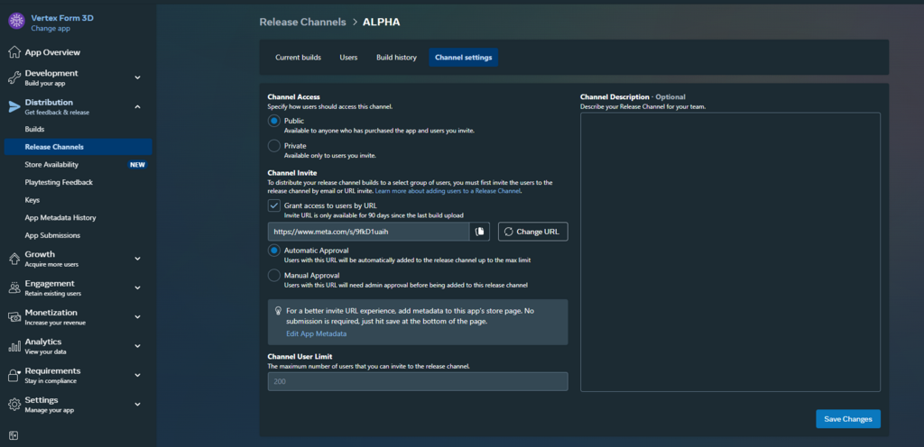 Publishing the alpha version of your app on Meta Quest is a simple and straightforward process that does not require approval. Your app will be accessible to others via an invite link.