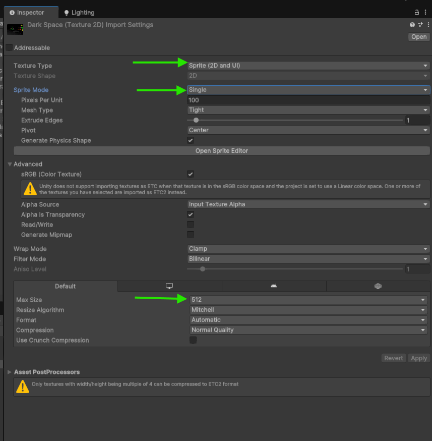 NOTE: To convert your .png or .jpg image into a sprite, select the image, go to the Inspector, and change the Texture Type from "Default" to "Sprite (2D and UI)." Additionally, set Sprite Mode to "Single" (not "Multiple"). To optimize performance, it is recommended to reduce the Max Size to 512 to minimize image file size.